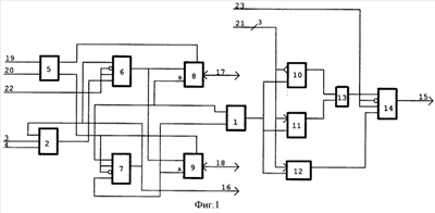 При сигнале управления диагностикой “23”=”0″ сигнал ошибки “15” формируется по заднему фронту первого сигнала группы входов 21 при несовпадении сигналов А и В на триггере 10, элементе ИЛИ 13 и мультиплексоре 14 или по переднему фронту второго сигнала группы входов 21 при несовпадении сигналов А и В на триггере 11, элементе ИЛИ 13 и мультиплексоре 14.
