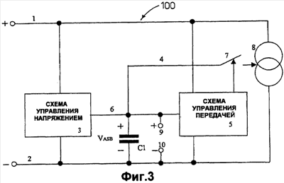 Между выводами 1 и 2 расположена управляющая схема VABS, обозначенная 3, способная управлять напряжением VASB на терминалах – выходных выводах 9 и 10. Управляющая схема VABS подсоединена посредством соединения 6 к конденсатору C1, расположенному между выходными выводами 9 и 10. Таким образом управляющая схема VABS поддерживает конденсатор C1 заряженным, чтобы управлять напряжением на терминалах выводов 9 и 10.