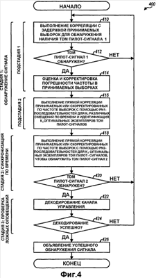 Фиг. 4 иллюстрируют блок-схему последовательности операций процесса 400 обнаружения сигнала, выполняемого терминалом. Терминал выполняет корреляцию с задержкой принимаемых выборок для обнаружения наличия TDM пилот-сигнала 1 (этапа 410). Это может осуществляться посредством выполнения корреляции с задержкой для каждого периода выборки и сравнения показателя корреляции с задержкой S(n) с нормализованным порогом. Если TDM пилот-сигнал 1 не обнаружен, как определено на этапе 412, то терминал возвращается к этапу 410 для выполнения корреляции с задержкой в следующем периоде выборки. Тем не менее, если TDM пилот-сигнал обнаружен 1, терминал оценивает погрешность частоты в принимаемой выборке и корректирует погрешность частоты (этап 414).