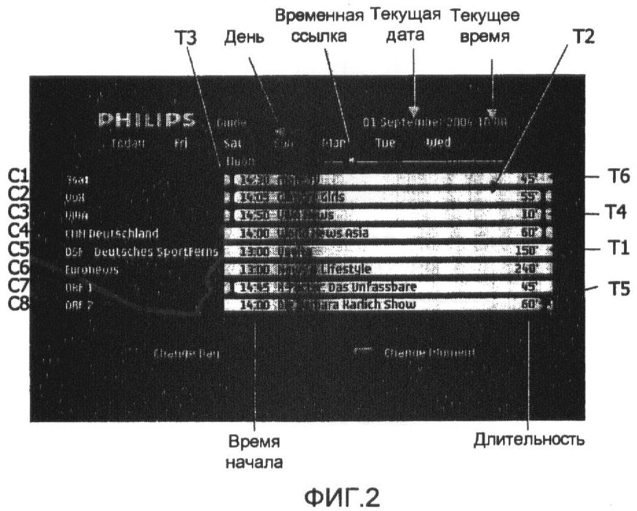 Как иллюстрируется на фиг.2, страница согласно изобретению содержит различные строки, назначенные соответственно разным каналам Ci (в этом неограничивающем примере i = 1 ~ 8, только i должно быть больше 1), и каждая строка содержит набор данных, определяющий программу канала, т.е. по меньшей мере первые данные, представляющие название программы канала, вторые данные, определяющие время начала программы канала, и третьи данные, определяющие длительность программы канала и/или время окончания. Страница также предпочтительно содержит день недели для облегчения просмотра для пользователя. Она также может содержать текущее время и/или текущую дату. Все эти данные для показа доставляются устройством D.