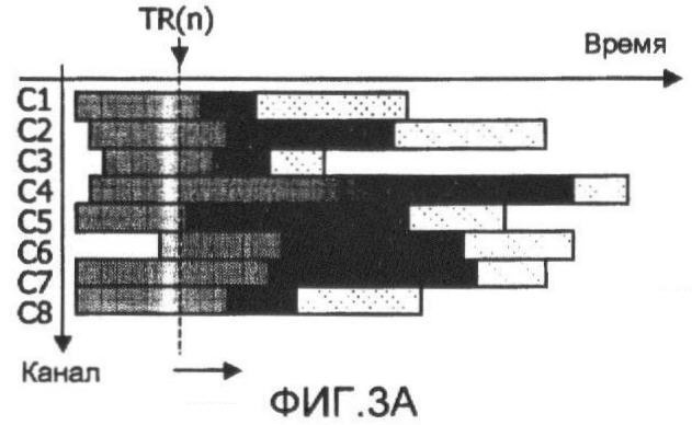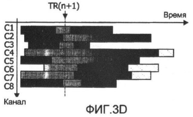 – фиг.3A-3D схематически иллюстрируют механизм, который дает возможность определения трех различных временных ссылок, начиная с первой ссылки (TR(n)) в примере частичной сетки из трех следующих друг за другом программ в 8 каналах,