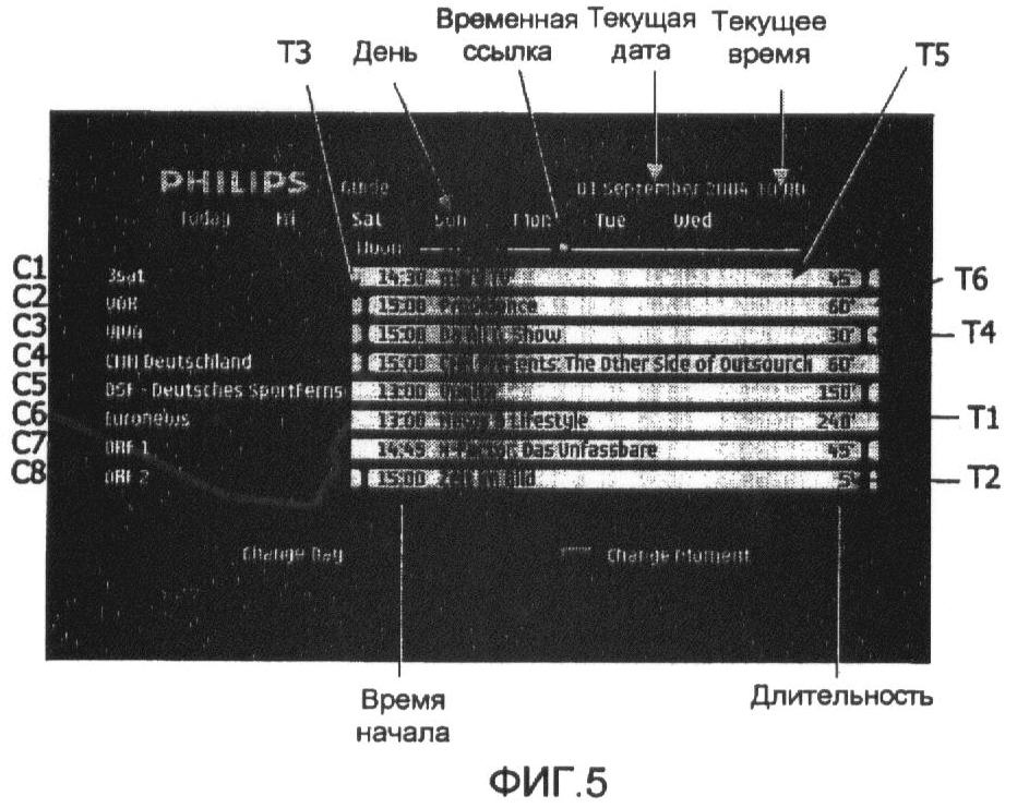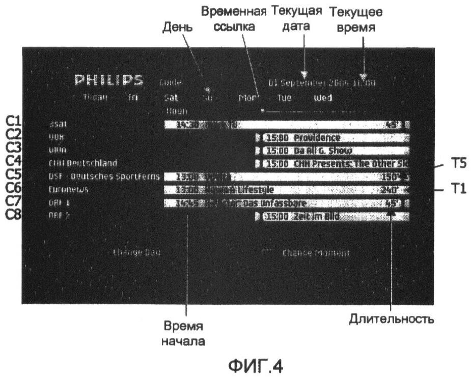 Как ранее упомянуто и как проиллюстрировано на фиг.2, 3 и 4, в дополнение к выбранным наборам данных, предназначенным для участия в показанной странице, модуль PM обработки также может доставлять первые вспомогательные данные, представляющие дату программы, в конечном счете выбранной пользователем, и/или вторые вспомогательные данные, представляющие день недели даты программы, в конечном счете выбранной пользователем, и/или третьи вспомогательные данные, представляющие положение временной ссылки TR в показанной странице в рамках по меньшей мере части из 24 часов дня, в конечном счете выбранной пользователем.