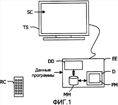 В проиллюстрированном (и неограничивающем) примере телеприставка EE цифрового ТВ содержит устройство D обработки данных (в дальнейшем «устройство») электронной программы передач (EPG), предназначенное для доставки наборов данных, отобранных в запоминающее устройство MM (в данном неограничивающем примере), к телевизору TS, чтобы они могли быть показаны на его экране SC.