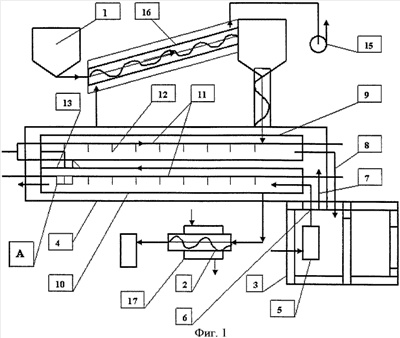 Реактор имеет газоотвод 14 топочных газов, который подсоединен к механизму загрузки древесного материала, снабженному вентилятором 15 для принудительного отвода топочных газов. Механизм загрузки древесных материалов снабжен загрузочным шнековым устройством 16, к которому подсоединен указанный газоотвод топочных газов. Наличие шнекового устройства в механизме загрузки и подсоединение к нему газоотвода топочных газов обеспечивает создание в установке дополнительной зоны сушки древесного материала, что позволяет использовать последний с более высокой влажностью.