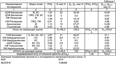 КТЦш – задаваемый коэффициент технологической ценности угольной шихты для коксования, значение которого выбирают (задают) в интервале между величинами КТЦк и КТЦс, но не менее 1. При значении КТЦ ш меньше 1 не обеспечивается качество металлургического кокса, а именно М25 и М10 (табл.5);