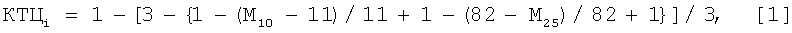 1. Лабораторным путем по индивидуальным коксованиям определяют показатели M25 и М10 кокса, полученного из каждого i-того угольного компонента, после чего определяют КТЦ каждого i-того угольного компонента, используемого для составления шихты и находящегося на складе, по формуле [1]: