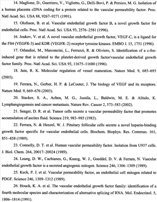 В 1983 году Senger et al. сообщили о частичном выделении из среды, кондиционированной опухолевой клеточной линией морской свинки, “фактора проницаемости сосудов” (VPF), белка, который индуцировал увеличение проницаемости сосудов кожи (21). Однако, поскольку VPF не был выделен и секвенирован, на тот момент молекулярная структура фактора осталась неизвестной. В 1989 году появилось сообщение о выделении из среды, кондиционированной фолликулярными клетками гипофиза коровы, “фактора роста эндотелия сосудов” (VEGF), специфичного в отношении эндотелиоцитов митогена (22). Аминоконцевая аминокислотная последовательность VEGF не совпадала ни с одним известным белком в доступных базах данных (22). Затем работа Connolly et al., выполненная на основе работы Senger et al., независимо привела к выделению и секвенированию VPF (23). Клонирование кДНК VEGF (24) и VPF (25) показало, что VEGF и VPF представляют собой одну и ту же молекулу. Этот результат был неожидан, учитывая, что другие митогены эндотелиоцитов, такие как FGF, не усиливают проницаемость сосудов.