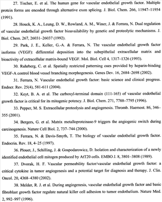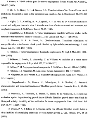 В 1971 году Folkman предположил, что подавление ангиогенеза могло бы являться эффективной противораковой стратегией (6). На основании этой революционной гипотезы в начале 1970-х годов Folkman et al. предприняли усилия, направленные на выделение “фактора опухолевого ангиогенеза” из опухолей человека и животных (7). В 1978 году Gullino также предположил, что блокирование ангиогенеза способно предотвратить развитие злокачественной опухоли (8). Впоследствии были описаны ангиогенные эффекты множества факторов (например, эпидермального фактора роста (EGF), трансформирующего фактора роста (TGF)- , TGF- , фактора- некроза опухоли (TNF- ) и ангиогенина) (9). Однако, хотя эти факторы усиливали ангиогенез в ходе некоторых биологических анализов, ни один из них не действовал физиологически (10).