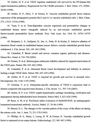 VEGF принципиально важен для нормального эмбрионального васкулогенеза и ангиогенеза. Инактивация отдельного аллеля VEGF у мышей приводит к эмбриональной смертности (44, 45). Ингибирование VEGF в раннем неонатальном периоде приводит к остановке роста, апоптозу эндотелиоцитов и летальному исходу главным образом в результате почечной недостаточности (46, 47). VEGF также необходим для внутрихрящевого окостенения, фундаментального механизма роста трубчатых костей. Ингибиторы VEGF подавляют эти процессы у грызунов и приматов (48, 49). Важно заметить, что этот эффект полностью обратим при прекращении анти-VEGF обработки (48, 49). Ангиогенез является ключевым аспектом нормального овариально-менструального цикла и функционирования эндометрия (50). Экспрессия мРНК VEGF связана во времени и пространстве с пролиферацией кровеносных сосудов в яичниках множества видов (51, 52). Введение ингибиторов VEGF замедляет развитие фолликулов (53) и подавляет ангиогенез в желтом теле грызунов (54) и приматов (49, 55, 56).