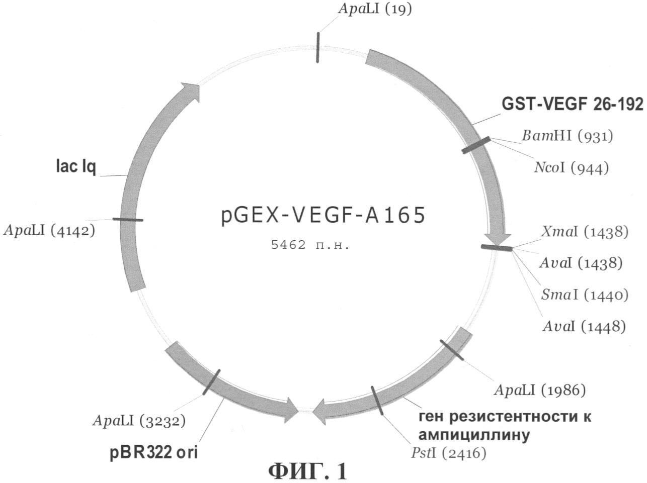 На фиг.1 приведена генетическая карта плазмиды pGEX-VEGF-A165. На фиг.2 показан результат анализа фракций, собранных в процессе очистки рекомбинантного белка GST-VEGF-A165. Пропорциональные количества белка из каждой фракции анализировали с помощью ДСН-ПАГЭ в 10%-ном акриламидном геле с последующим окрашиванием геля красителем Coomassie Brilliant Blue (Serva). Для оценки молекулярной массы белков использовали маркер молекулярной массы Unstained Protein Molecular Weight Marker производства (Fermentas), крайняя дорожка справа. Стрелка указывает на положение в геле рекомбинантного белка GST-VEGF-A165. Кажущаяся молекулярная масса белка GST-VEGF-A165 составляет около 45 кДа и соответствует теоретически рассчитанной (45526 Да).