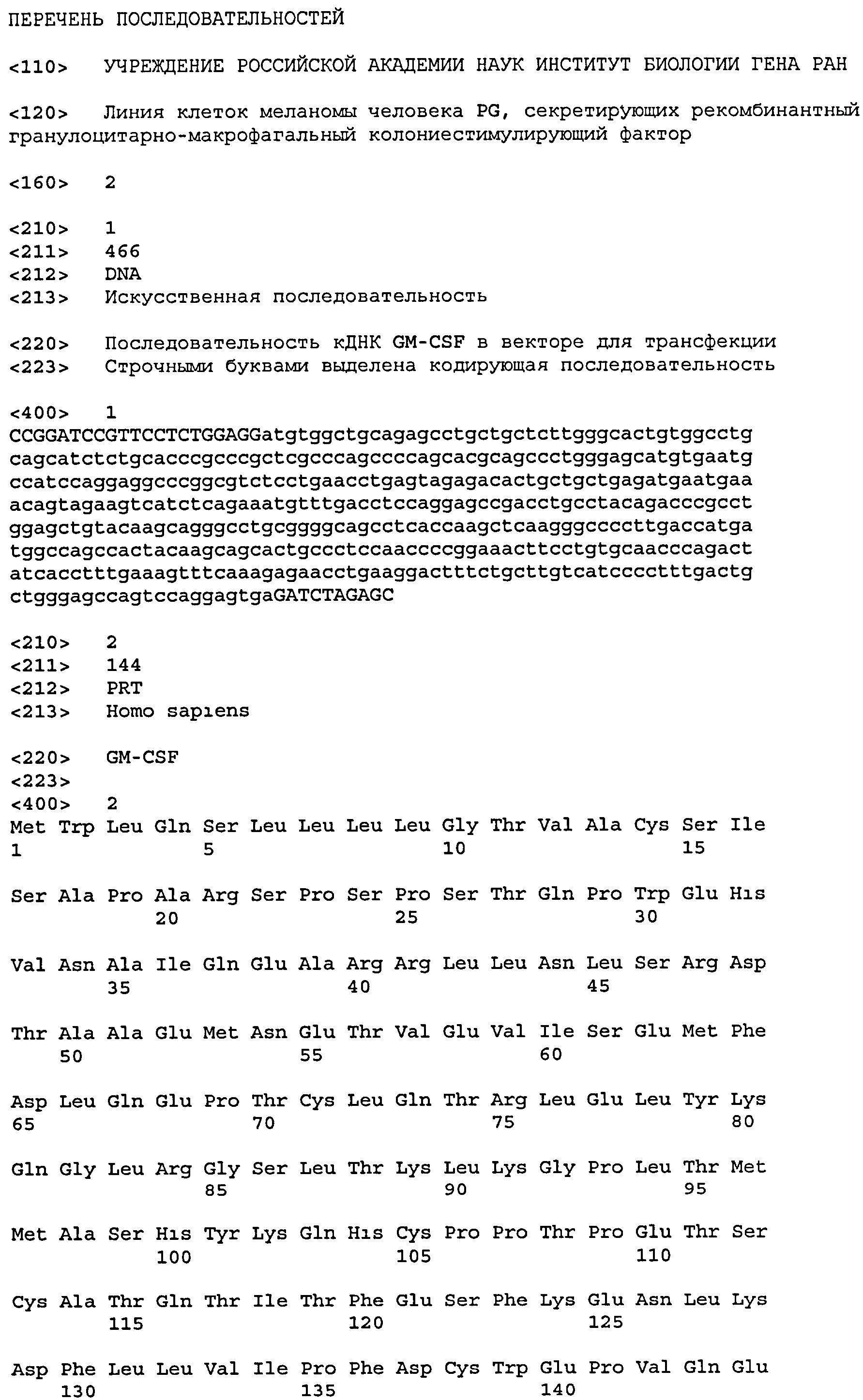 Линия клеток меланомы человека PG, секретирующих рекомбинантный гранулоцитарно-макрофагальный колониестимулирующий фактор человека, кодируемый последовательностью ДНК SEQ ID NO:1, депонированная в Специализированной коллекции культур клеток позвоночных Российской коллекции клеточных культур под номером РККК (П) 702Д.