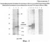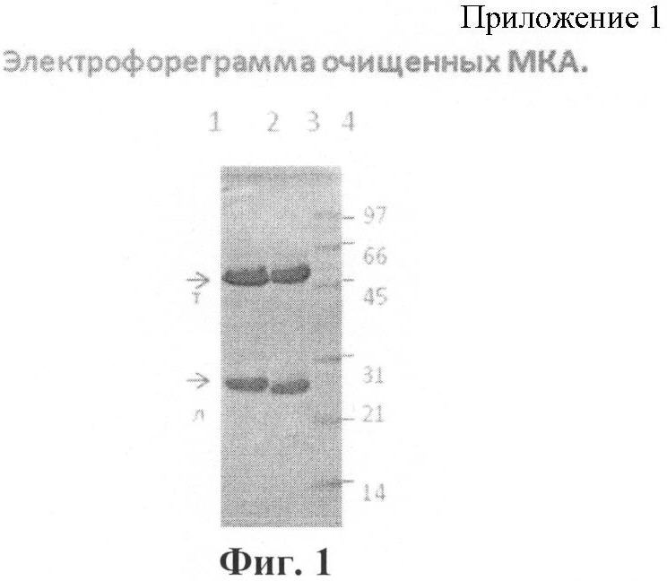 Пример 2. Выделение очищенных моноклональных антител, продуцируемых гибридными культивируемыми клетками штаммов Mus musculus L. ГНЦ ВБ “Вектор” – 4А2 и Mus musculus L. ГНЦ ВБ “Вектор” 1С1. Один объем асцитической жидкости, содержащей МКА, разводят 4 объемами 0,6 М ацетатного буфера (0,04 М лимонной кислоты, 0,2 М натрия ацетата), рН 4,0, и доводят рН до 4,5 с помощью 0,1 N раствора едкого натра. К разведенному образцу добавляют по каплям с постоянным перемешиванием каприловую кислоту из расчета 25 мкл на 1 мл раствора и инкубируют ночь при +4°С. Затем центрифугируют 30 мин при 8000 g и осадок удаляют, а надосадок смешивают с 10-кратным фосфатно-солевым буфером (ФСБ) и устанавливают рН 7,4 раствором 1,0 N едкого натра. Равный объем насыщенного раствора сульфата аммония добавляют к этому раствору, встряхивают и выдерживают ночь при +4°С или 30 мин при +20-25°С. Центрифугируют 15 мин при 5000 g. Надосадок сливают, а осадок растворяют в ФСБ, рН 7,4. Остатки сульфата аммония удаляют путем диализа против 50-100 объемов ФСБ, рН 7,4. Электрофорез очищенных препаратов МКА проводили по методу, описанному в работе [25], в прерывистой буферной системе с использованием 12-15% полиакриламидного геля с 0,1% додецилсульфата натрия в трис-глициновом буфере. Разделяющий гель содержал 0,0625М трис-HCl (рН 8,8), 0,1% SDS, 10(15)% акриламид, 1% N,N-метиленбисакриламид. Препараты МКА (по 1 мкл) наносили на дорожку в объеме 30 мкл буфера, содержащем 0,0625М трис-HCl (рН 6,8), 2% SDS, 5% 2-меркаптоэтанол, 10% глицерин, 0,01% бромфеноловый синий. Перед нанесением буфер, содержащий МКА, прогревали 3 мин при 95°С. Электрофорез вели в режиме 10 В/см. Окраску геля проводили при помощи Кумасси G-250-Очищенные препараты в виде электрофореграммы представлены на фиг.1.