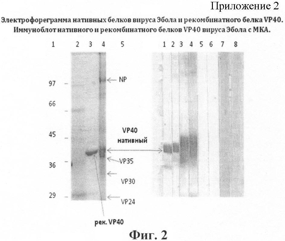 Указанный технический результат достигается также получением моноклональных антител 4А2, продуцируемых штаммом гибридных клеток животного Mus musculus l. 4A2 (субкласс иммуноглобулинов IgG1, имеющих тяжелую 55 кДа и легкую 25 кДа цепь), и моноклональных антител 1C1, продуцируемых штаммом гибридных клеток животного Mus musculus 1. 1C1 (субкласс иммуноглобулинов IgG1, имеющие тяжелую 55 кДа и легкую 25 кДа цепи), используемых совместно в иммуноферментной системе формата “сэндвич” для выявления матриксного белка VP40 вируса Эбола, субтип Заир (штамм Mainga).