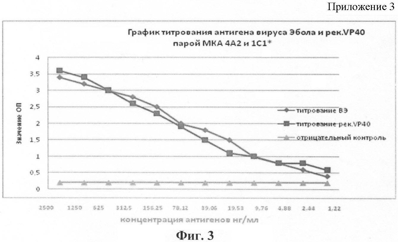 На фиг.3 представлен график титрования антигена вируса Эбола и рекомбинантного белка VP40 парой МКА 4А2 и 1С1*, где исходная концентрация препаратов антигенов по СФ 1 мг/мл, первая точка титрования в разведении 1:400 соответствует концентрации 2500 нг/мл;