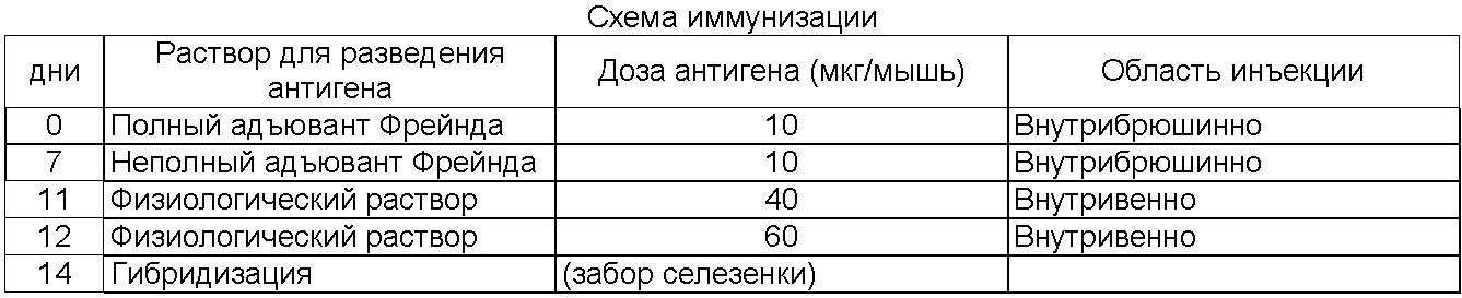 Штаммы гибридных клеток Mus musculus L. ГНЦ ВБ “Вектор” – 4А2 и Mus musculus L. ГНЦ ВБ “Вектор” 1С1 получают следующим образом. Самок мышей BALB/c (виварий ГНЦВБ “Вектор”) массой 15-20 г иммунизируют по схеме, которая приведена ниже в таблице.