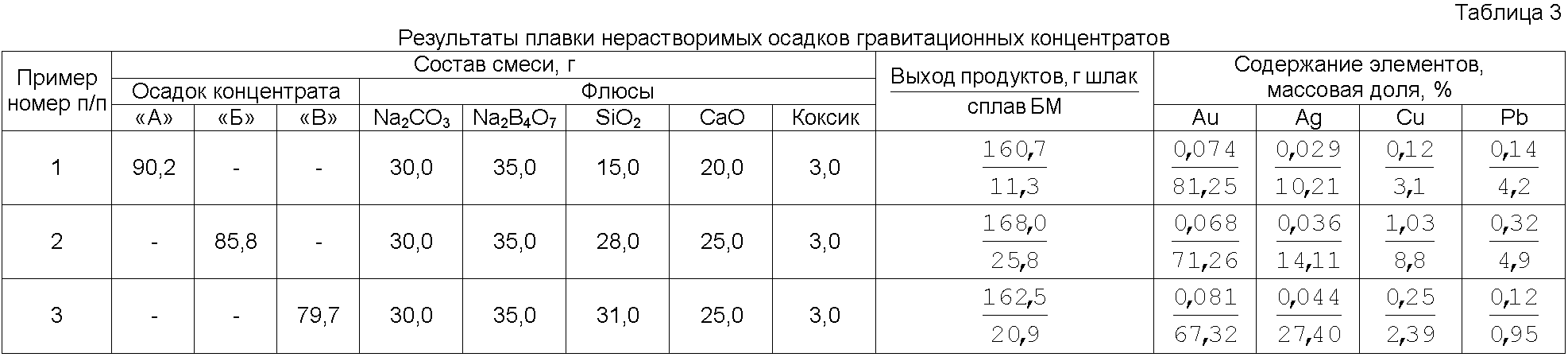 Данные, приведенные в таблице 4, показывают, что использование заявляемого способа позволяет повысить извлечение в целевой сплав благородных металлов золота на 0.45% и серебра на 2,02% вследствие устранения потерь благородных металлов с пылью и снижения их остаточного содержания в шлаках. За счет предотвращения выделения оксида серы в газовую фазу и соответствующих затрат на улавливание сернистого ангидрида в специальных устройствах общие затраты на переработку концентрата снижаются примерно на 10÷15%. Для доказательства критерия «промышленное применение» заявленный способ планируется к опытному испытанию в ОАО «Иргиредмет». Источники информации 1. Патент РФ 2. Патент РФ