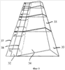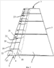 После разложения панелей участков листов, которые были уложены друг на друга, вокруг линий сгибания 42 стенд 31 раскладывается под действием упругих средств 41 для установки с помощью треугольной основы 43, служащей для монтажа и опоры (фиг.6), стороны которой образованы смежными поперечными краями 41-46 трех плоских участков 32-34.