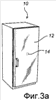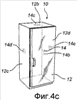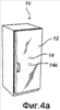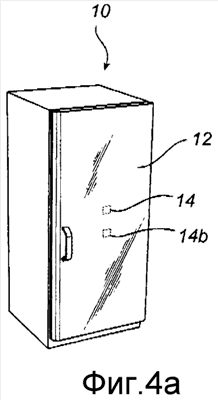 На фиг.4а бытовым электроприбором является холодильник, а дополнительный возбуждающий элемент 14b размещен на верхней панели 12 вместе с первым возбуждающим элементом 14. Дополнительный возбуждающий элемент 14b так же, как и первый возбуждающий элемент 14, соединен с усилителем 18 и источником звука 16а/приемником аудиосигнала 16b. Возбуждающие элементы 14 и 14b (оба прикреплены к передней панели 12) могут относиться к различным типам или иметь различные характеристики для расширения диапазона звуковых частот, испускаемых поверхностью 12.