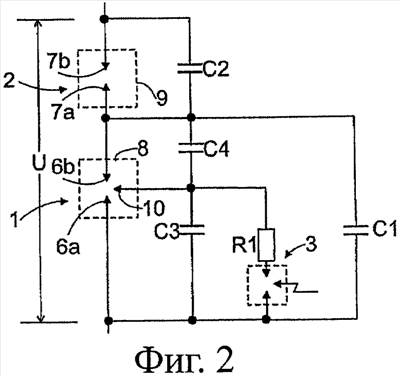 11. Устройство по любому из пп.7-10, характеризующееся тем, что емкость первых конденсаторов (C1, С2) более чем в два раза выше, чем емкость соединенных последовательно вторых конденсаторов (С3, С4).