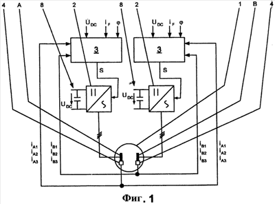 Машина 1 имеет, по крайней мере, две группы обмоток статора A, B, т.е. наличие более чем двух групп обмоток статора A, B также возможно. Каждая группа обмоток статора A, B обычно содержит n фазных обмоток, где n 3. В вариантах, представленных на фиг.1 и 3, показаны две группы обмоток статора A, B, каждая из которых имеет n=3 фазных обмоток. Как показано на фиг.1 и фиг.3, в каждом случае каждой группе обмоток статора A, B придан один преобразователь 2. Соответствующая группа обмоток статора A, B получает питание от приданного ей преобразователя 2.
