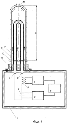 По мере работы установки воздушно-озоновая смесь в пространстве между кожухом 9 и импульсной газоразрядной лампой 7 нагревается за счет значительного тепловыделения с поверхности трубки импульсной газоразрядной лампы 7 (в используемых режимах около 40% вложенной электрической энергии превращается в теплоту) и ее температура быстро растет. Экспериментальные данные показывают, что температура стенок кожуха 9, трубки импульсной газоразрядной лампы 7 и газа (озоновоздушной смеси) в пространстве между ними достигает квазистационарного значения уже через 40÷80 секунд с начала работы.