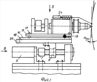 Базовая плита 19 имеет опоры, например танкетки 21, которые установлены на направляющие 22, жестко связанные с основанием 23 сварочной головки. На корпусе шпинделя установлен датчик 24 для отслеживания формы свариваемого изделия.
