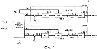 Блок 50-2 управления напряжением включает в себя блоки 52-2 и 56-2 вычитания, блок 54-2 пропорционально-интегрального (PI) регулирования, блок 55-2 переключения и блок 58-2 модуляции. Блок 50-2 управления напряжением имеет практически такую же конструкцию, что и блок 50-1 управления напряжением. Таким образом, блок 54-2 пропорционально-интегрального (PI) регулирования является элементом компенсации ОС по напряжению, использующим отклонение между напряжением VR2 задания и значением Vh напряжения, а входной элемент (значение Vb2 напряжения)/(напряжение VR2 задания) блока вычитания 56-2 является элементом компенсации с возмущением по напряжению на основе теоретического коэффициента повышения преобразователя 8-2. Когда сигнал SW2 переключения, предоставленный от блока 70 управления переключением, активен, блок 55-2 переключения активирует функцию регулирования с возмущением по напряжению, которая должна выполняться посредством блока 54-2 пропорционально-интегрального (PI) регулирования. Когда сигнал SW2 переключения является неактивным, он деактивирует функцию регулирования с возмущением по напряжению, которая должна выполняться посредством блока 54-2 пропорционально-интегрального (PI) регулирования.