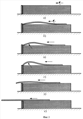 Разделение выполняют путем отгибания одного края листа, например, струями воздуха (см. а.с. 284286, опубл. 14.10.1970 г., Бюл. 32 и патент РФ 94032558 «Способ разделения уложенных в стопу листов, преимущественно бумажных», опубл. 10.12.95 г., Бюл. 34), где плоские воздушные потоки направляют в незакрепленные торцевые части стопы, а также с использованием вакуумных захватов (см. а.с. 1101393 «Способ подачи листов», опубл. 07.07.84 г., Бюл. 25 и пат. РФ 2170208 «Способ захвата и отделения верхнего листа в стопе и его дальнейшего премещения», опубл. 10.07 2001 г., Бюл. 19). В них отделяют край верхнего листа от стопы, перегибают его в двух параллельных горизонтальных поверхностях и транспортируют в направлении подачи листа.