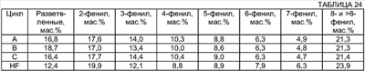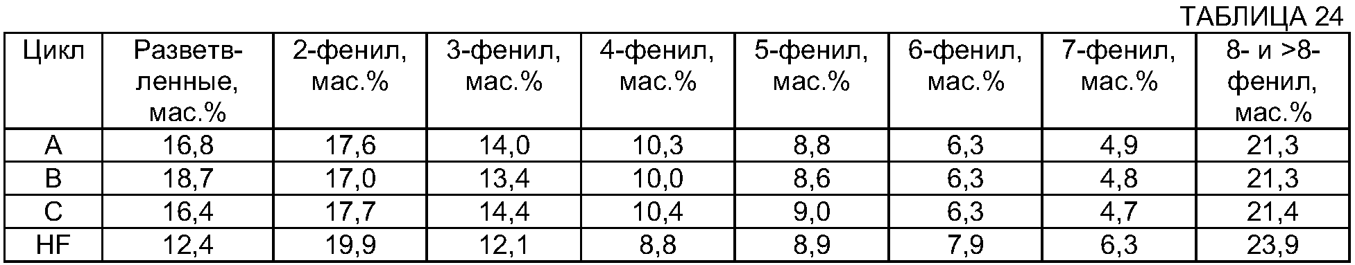 В Табл.24 распределение изомеров относительно аналогично при сравнении продуктов, полученных с применением цеолита Y, и продуктов, полученных с применением HF. Основное отличие связано с содержанием разветвленного алкилата. Как можно видеть, количество разветвленного алкилата, получаемого, когда используют цеолит Y, допированный редкоземельными металлами, составляет примерно на 4 мас.% больше, чем количество, полученное, когда используют HF в качестве катализатора. Это небольшое отличие не является важным при условии, что разветвленный алкилат не влияет на свойства детергента. По отношению к содержанию 2-фенил изомера можно видеть, что с помощью HF технологии получают немного большее количество 2-фенил изомера, чем в случае модифицированного цеолита Y.
