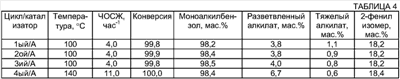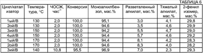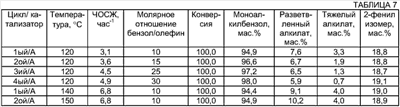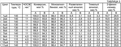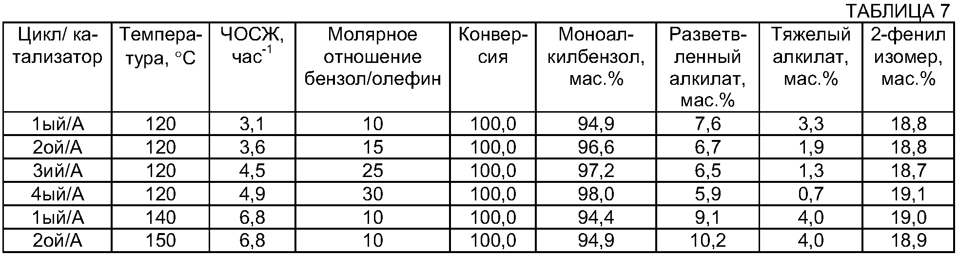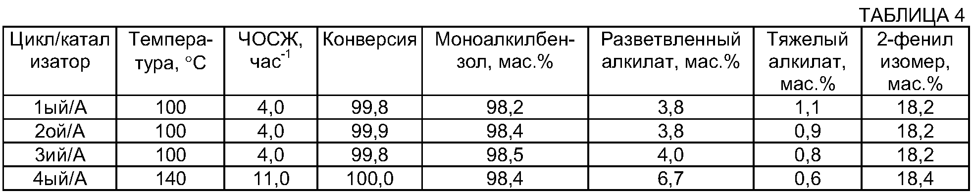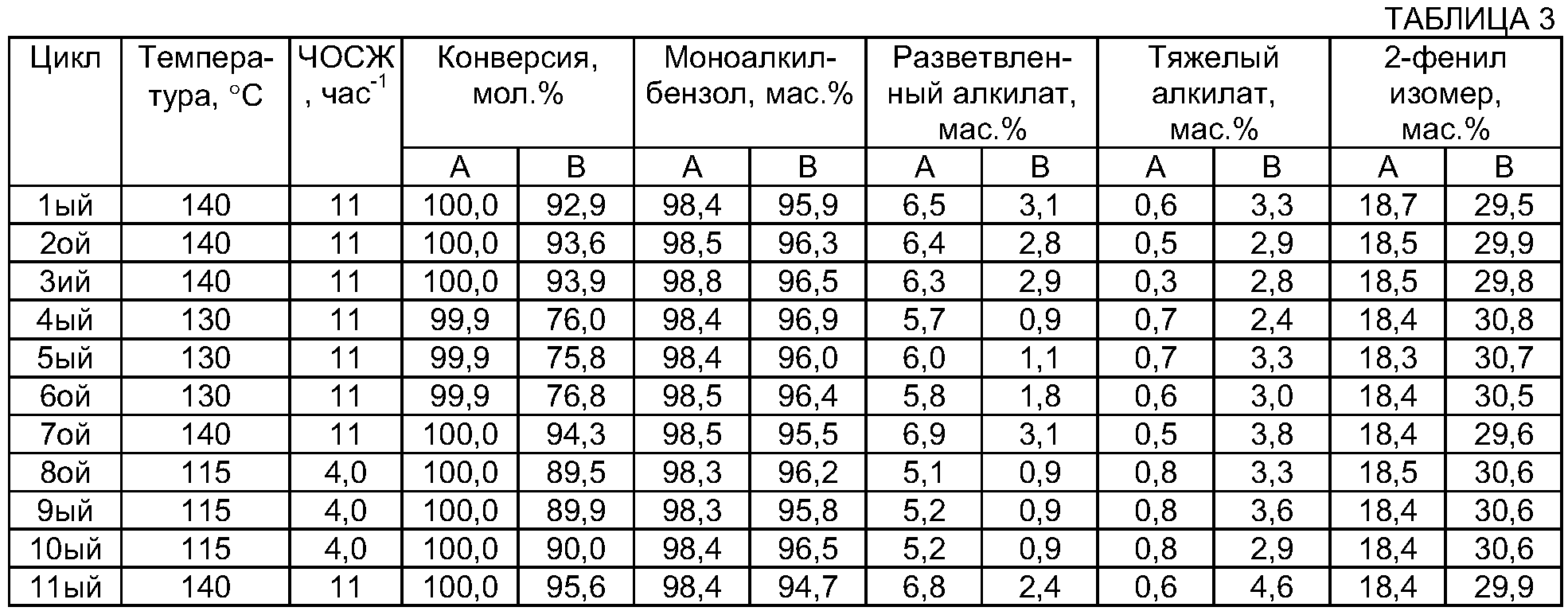 Были выполнены двенадцать циклов реакции алкилирования, используя цеолит Y. Первые три цикла были выполнены при ЧОСЖ, равной 8 час-1, и Т=150°C (цикл А). Затем три цикла были выполнены при ЧОСЖ, равной 6 час-1, и Т=150°С (цикл В). Последние четыре цикла были выполнены при ЧОСЖ, равной 4 час-1, два из них при Т=150°С и последние два при более низкой температуре, Т=140°С (цикл С). Все эти циклы выполняли с целью анализа влияния температуры и объемной скорости на выход катализатора. Продукты анализировали посредством газовой хроматографии (ГХ) и детектора ионизации пламени (ДИП).