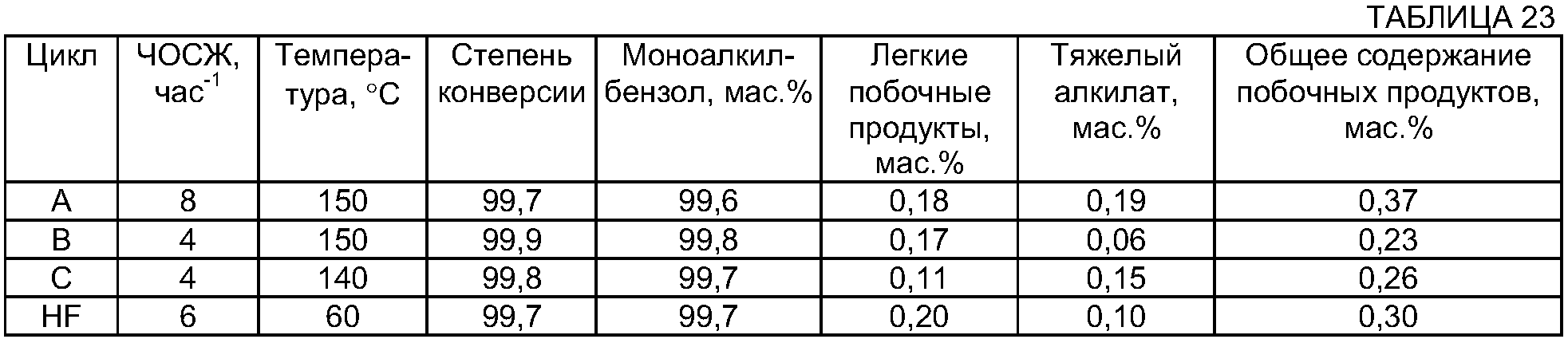 Как видно в Табл.23, активность цеолита Y, допированного редкоземельными металлами, всегда выше 99,7% при рассмотрении в показателях степени конверсии олефина. Это означает, что цеолит Y после ионного обмена с редкоземельными металлами является высокоактивным. Когда анализировали полученные побочные продукты, оба катализатора (модифицированный цеолит Y и HF) обладали высокой селективностью в отношении сведения к минимуму легких побочных продуктов и тяжелого алкилата. Общее количество побочных продуктов, полученных посредством цеолита Y, ниже 0,4 мас.% в трех оцениваемых циклах, а в циклах В и С даже ниже, чем при использовании HF, следовательно, это ясно показывает, что цеолит Y, допированный редкоземельными металлами, является высокоселективным при технологии с использованием реактора с неподвижным слоем.