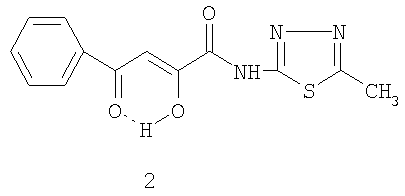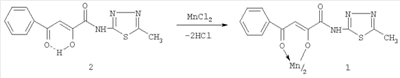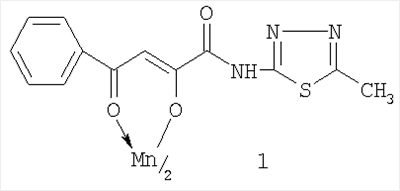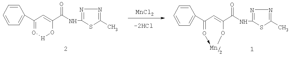 Заявляемое соединение 1 синтезируют взаимодействием N-[2-(5-метил-1,3,4-тиадиазолил)]амида 2-гидрокси-4-оксо-4-фенил-2-бутеновой кислоты (2) с дихлоридом марганца при соотношении реагентов 2:1 в среде диоксан – спирт этиловый (1:0,5), при нагревании с последующим выделением целевого продукта известными методами по схеме: