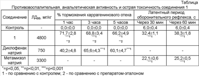 В ходе проведенных исследований (см. табл.) установлено, что соединение 1 проявляет также выраженную анальгетическую активность на всех сроках наблюдения. Так, через 30 минут после введения оно уже превышает действие метамизола натрия, а через 60 минут его активность увеличивается и превышает препарат сравнения в 1,5 раза. С учетом значений острой токсичности терапевтическая эффективность и безопасность соединения 1 значительно выше препарата сравнения.