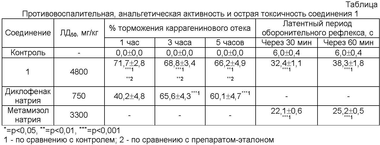 Как видно из таблицы, соединение 1 проявило выраженную противовоспалительную активность в течение всего периода наблюдения и на пике воспаления оно активнее диклофенака. Необходимо отметить, что эффективная доза диклофенака составляет 0,13 от его ЛД50, а у заявляемого соединения – 0,010 от его ЛД50, что свидетельствует об определенных преимуществах соединения 1 перед диклофенаком по его безопасности и эффективности.