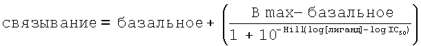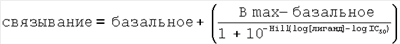 где Hill представляет собой коэффициент Хилла, [лиганд] представляет собой концентрацию конкурирующего радиолиганда и IC50 представляет собой концентрацию радиолиганда, обеспечивающую половину от максимального специфического связывания радиолиганда. Окно специфического связывания представляет собой разницу между параметрами Bmax и «базальное».