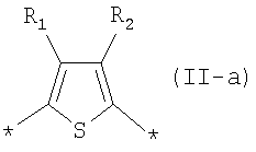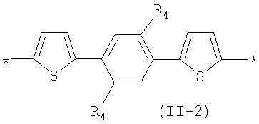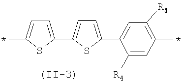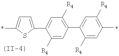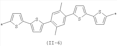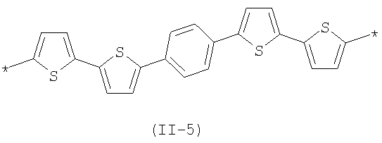 Другим предпочтительным примером такого сочетания являются комбинация различных незамещенных тиенильных фрагментов, соединенных друг с другом в положениях 2 и 5, и различных 2,5-замещенных фенил-1,4-диильных фрагментов, соединенных друг с другом в положениях 1 и 4 таким образом, что их общее количество равно n, например фрагменты, представленные формулами (II-1)-(II-12):
