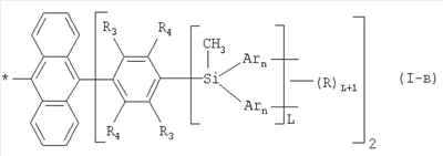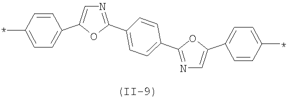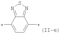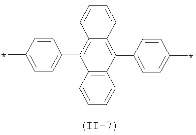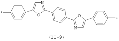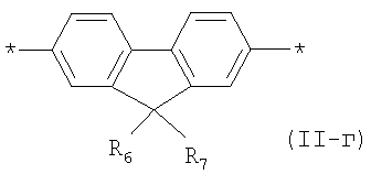 Предпочтительными примерами таких звеньев являются незамещенный фенил-1,4-диил (II-б-1), замещенный фенил-1,4-диил (II-б-2), незамещенный тиенил-2,5-диил (II-а-3), антрацен-9,10-диил (II-д), 1,3,4-оксадиазол-2,5-диил (II-е).