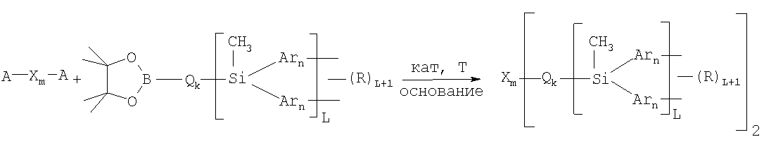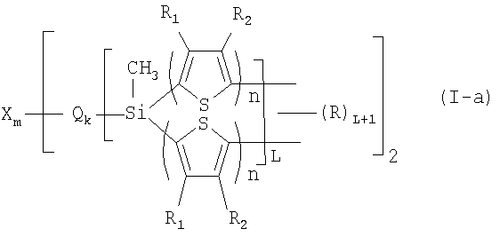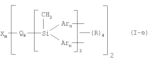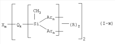 Положения, отмеченные в формулах (II-а-1)-(II-а-3) и (II-1)-(II-9) знаком * (звездочка), являются точками соединения, в которых структурные фрагменты (II-а)-(II-к) связаны друг с другом в форме линейных сопряженных олигомерных цепей Arn, Xm Qk или концами цепей Arn или Xm(Qk)2, связанных с атомами кремния в точках ветвления или с концевыми заместителями R.