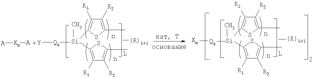 В контексте данного изобретения под Qk понимается любое сочетание из k звеньев одинаковых или различных Q, выбранных из вышеприведенного ряда. Предпочтительными примерами такого сочетания являются незамещенный тиенил-2,5-диил (II-а-3), незамещенный фенил-1,4-диил (II-б-1), k одинаковых незамещенных тиенил-2,5-диильных фрагментов, соединенных друг с другом в положениях 2 и 5, например 2,2 -битиенил-2,5 -диил (II-а-1), 2,2 :5 ,2 -тертиенил-2,5 -диил (II-а-2):