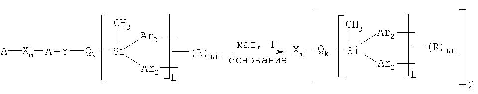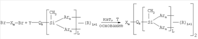 В частности, в соединении формулы (IV) X может означать фенил-1,4-диил выбранный из ряда (II-б), с условием, что радикалы Ar и Q означают тиенил-2,5-диил, выбранный из ряда соединений формулы (II-а), тогда разветвленный олигоарилсилан получают по следующей общей схеме: