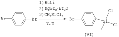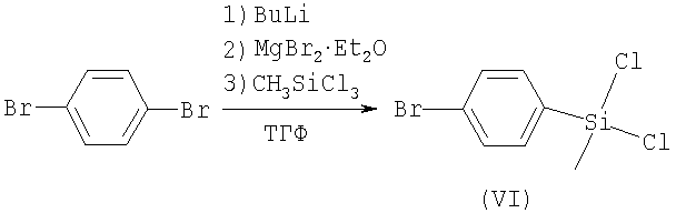 К раствору 40.00 г (0.17 моль) 1,4-дибромбензола в 800 мл ТГФ прибавили 67.82 мл (0.17 моль) 2.5 М раствора н-бутиллития в гексане при температуре -50°С. Реакционную смесь перемешивали в течение двух часов, после чего добавили раствор эфирного комплекса бромида магния, свежеприготовленного из 4.56 г (0.19 моль) магния и 34.08 г (0.181 моль) дибромэтана и 120 мл диэтилового эфира. Полученный таким образом реактив Гриньяра прибавили к раствору 150 мл (1.36 ммоль) метилтрихлорсилана в 150 мл ТГФ при температуре -20°С. После фильтрования под аргоном и перегонки в вакууме (Ткип=57°С/0.12 мбар) получили 18.41 г (40% от теоретически возможного) соединения VI. 1H ЯМР (CDCl3): 1,02 (с, 3H); 7,59 (д, 1H, L=1,8 Гц).