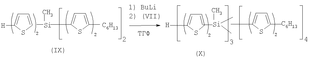 Соединение X получали аналогично методике синтеза соединения IX из 16.20 г (22.90 ммоль) соединения IX, 9.16 мл 2.5 М раствора н-бутиллития (22.90 ммоль) в гексане, 3.20 г (11.45 ммоль) соединения VII и 450 мл ТГФ. Через 60 минут перемешивания реакционной смеси реакционный выход составил 90% (по данным ГПХ). После выделения и очистки было получено 15.00 г (81% от теоретически возможного) хроматографически чистого соединения X. 1Н ЯМР ( в ДМСО-CCl4, ТМС/м.д.): 0.87 (т, 12Н, J=6.7 Гц), 0.91 (с, 6Н), 0.94 (с, 3Н), 1.22-1.39 (перекрывающиеся сигналы, 24Н), 1.63 (м, 8 Н, М=5,.J=7.3 Гц), 2.75 (т, 8Н, J=7.3 Гц), 6.68 (д, 4Н, J=3.7 Гц), 7.00 (д, 1Н, J=3.7 Гц), 7.03 (д, 4Н, J=3.7 Гц), 7.20 (д, 4Н, J=3.7 Гц), 7.24 (д, 1H, J=3.7 Гц), 7.28 (д, 4Н, J=3.7 Гц), 7.30-7.35 (перекрывающиеся сигналы, 6Н), 7.35-7.40 (перекрывающиеся сигналы, 5Н). 13С ЯМР (S в CDCl3): -0.24, -0.19, 14.07, 22.55, 28.71, 30.14, 31.50, 31.54, 123.97, 124.34, 124.81, 125.15, 125.67, 125.69, 127.82, 132.87, 133.61, 134.26, 134.28, 134.74, 136.90, 137.82, 137.88, 137.91, 143.91, 144.12, 145.18, 145.92. 29SiЯМР ( in CDCl3): -25.23, -25.08. Найдено для C83H90S14Si3 (%): С 61.39; Н 5.64; S 27.60; Si 5.08. Вычислено (%): С 61.51; Н 5.60; S 27.70; Si 5.20.