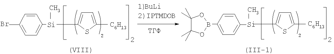 Пример 6. Синтез бис(5 -гексил-2,2 -битиен-5-ил)(метил)[4-(4,4,5,5-тетраметил-1,3,2-диоксиборолан-2-ил)фенил]силан (III-1)