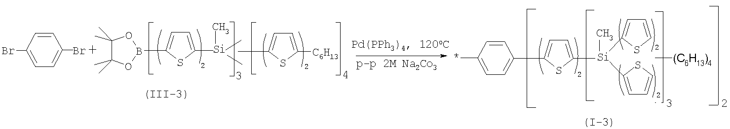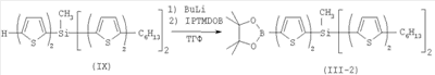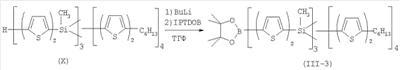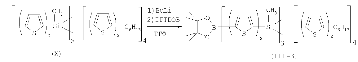 Пример 8. Синтез [{метил[5 -(4,4,5,5-тетраметил-1,3,2-диоксиборолан-2-ил)-2,2 -битиен-5-ил]силандиил}бис(2,2 -битиене-5 ,5-диил)]бис[бис(5 -гексил-2,2,-битиен-5-ил)(метил)силана] (III-3)