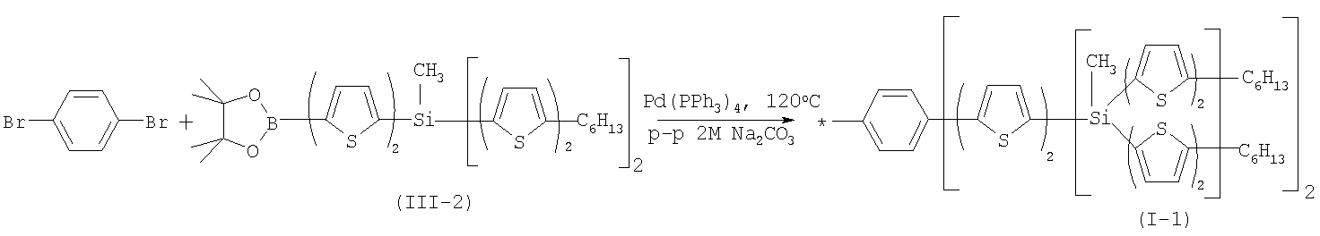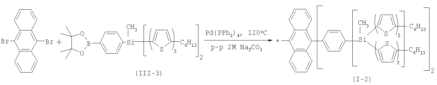 Разветвленный олигоарилсилан I-2 получали по общей методике синтеза из 1.23 г соединения III-1, 0.23 г 9,10-дибромантрацен, 0.096 г катализатора Pd(PPh3)4, 2,5 мл 2М раствора Na2CO3 в воде и 30 мл толуола. После выделения и очистки было получено 0.937 г (97% от теоретически возможного) чистого разветвленного олигоарилсилана (I-2). 1Н ЯМР (250 МГц, в CDCl3, ТМС/м.д.): 0.88 (т, 12Н, J=6.7 Гц), 1.03 (с, 6Н), 1.25-1.45 (перекрывающиеся сигналы, 24 Н), 1.63 (м, 8Н, М=5, J=7.3 Гц), 2.78 (т, 8Н, J=7.3 Гц), 6.69 (д, 4Н, J=3.7 Гц), 7.06 (д, 4Н, J=3.7 Гц), 7.24 (д, 4Н, J=3.7 Гц), 7.28-7.37 (перекрывающиеся сигналы, 8Н), 7.51 (д, 4Н, J=7.9 Гц), 7.69 (д, 2Н, J=3.1), 7.72 (д, 2Н, J=3.1 Гц), 7.87 (д, 4Н, J=7.9 Гц).