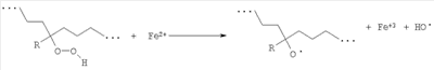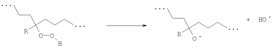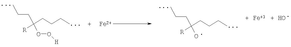 Стимуляторы разложения, такие как ранее упомянутые соединения железа, обеспечивают разложение групп гидроперекисей в полимерной цепи. Таким образом, образуются в основном радикальные соединения. Соединение железа выступает в роли катализатора в том смысле, что разложение одного моля групп гидроперекисей требует наличия соединения железа в количестве, значительно меньшем одного моля.