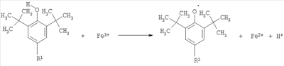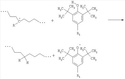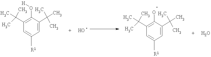 Фенольные антиоксиданты, такие как соединения на основе производных 2,6-ди-трет-бутила – так называемые пространственно затрудненные фенолы, на первой стадии вступают в реакцию с различными типами реакционно-способных радикалов, таких как углеродцентрированные полимерные радикалы. Радикалы, образованные пространственно затрудненными фенолами, являются стабильными радикалами. Данные радикалы могут обратимо рекомбинировать с различными типами радикалов тем же самым образом, что и акцепторы радикалов (см. формулу 2b). Антиоксиданты на основе производных бензофуранона и гидроксиламинов вступают в реакцию подобно пространственно затрудненным фенолам.