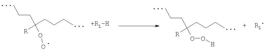 Процесс разложения в термопласте, таком как полиолефин, в основном протекает в соответствии с механизмами, описанными, например, в работе Hans Zweifel (ed.), Plastic additives handbook , Hanser, München, 2000, p.4 and p.18. Поглощение кислорода приводит к образованию гидроперекисей и последующему прохождению окислительной деструкции термопласта в результате разложения гидроперекисей. Присутствие соединений металлов, таких как стеарат железа, ускоряет разложение гидроперекисей. Типичные стадии окислительной деструкции олефинов продемонстрированы в формулах 1а-1с: