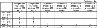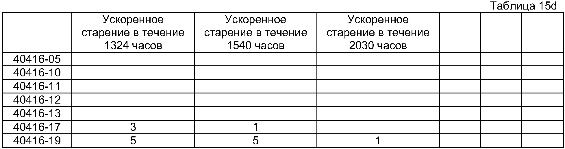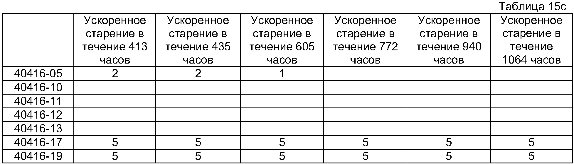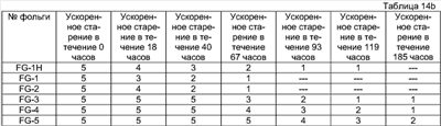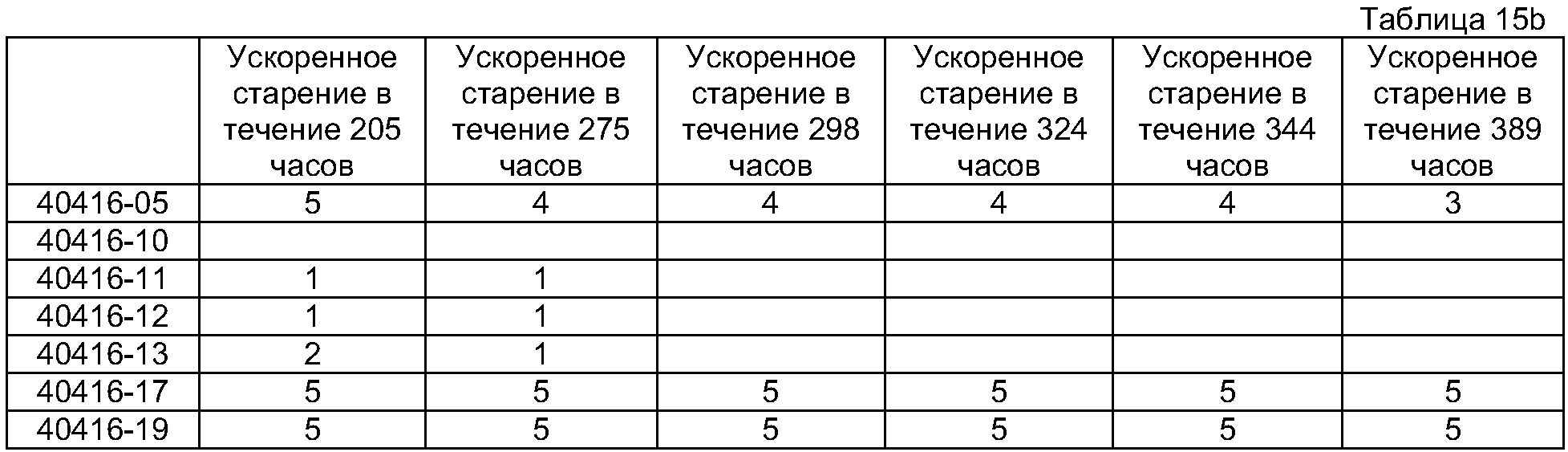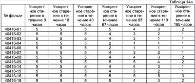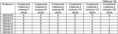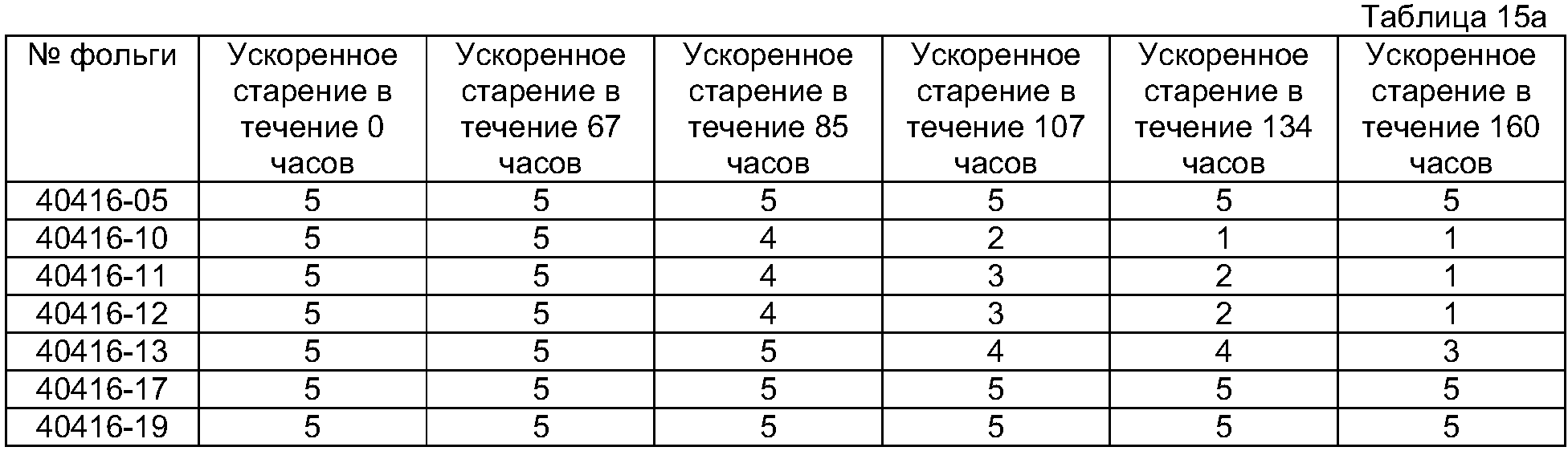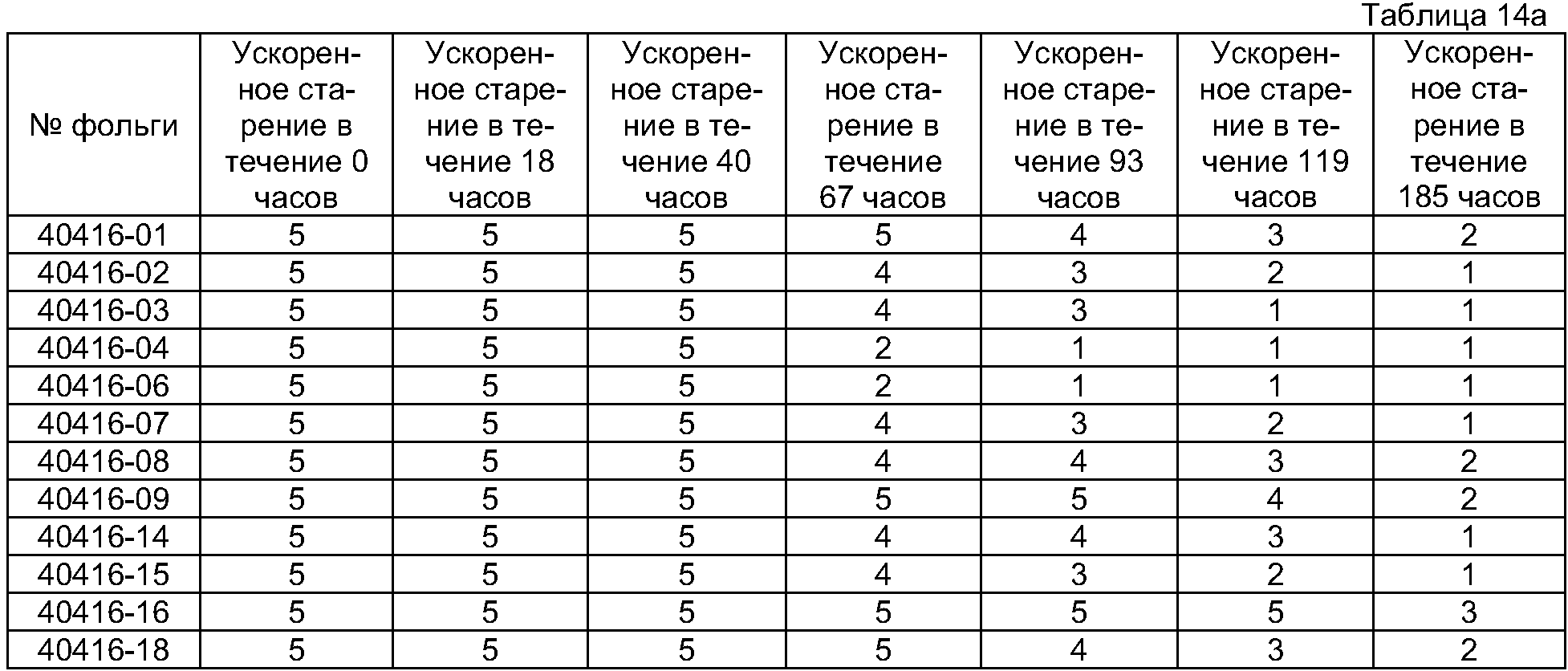 Несколько пленочных образцов из эксперимента 9 при 120°С подвергали ускоренному старению в конвекционной печи при наличии циркуляции воздуха. Характеристики хода разложения получали в результате проведения оценки податливости и состояния фольги при использовании простого испытания, описанного выше в пункте а). Результаты продемонстрированы в таблице 16 и таблице 17.
