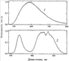 На чертеже изображены нормированные к максимальной интенсивности «квантовые» спектры люминесценции (кривая 1) и ее возбуждения (кривая 2) образца 3.